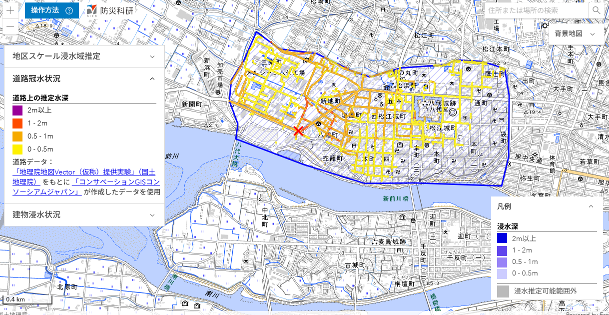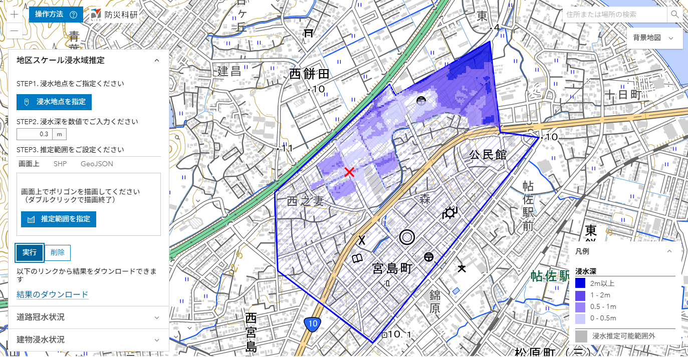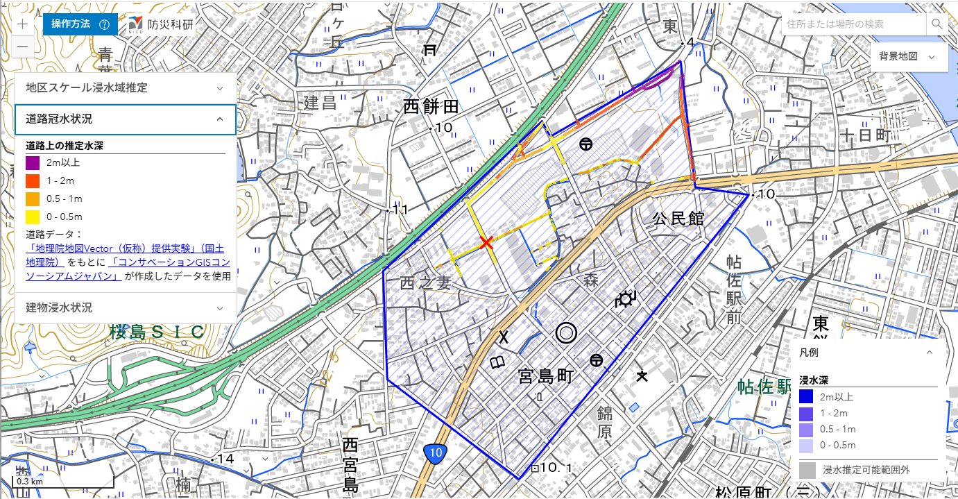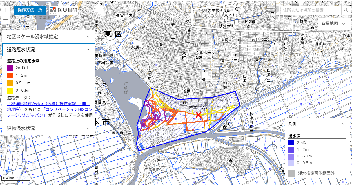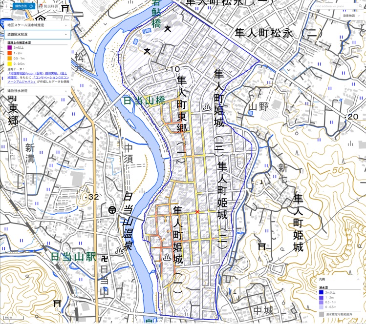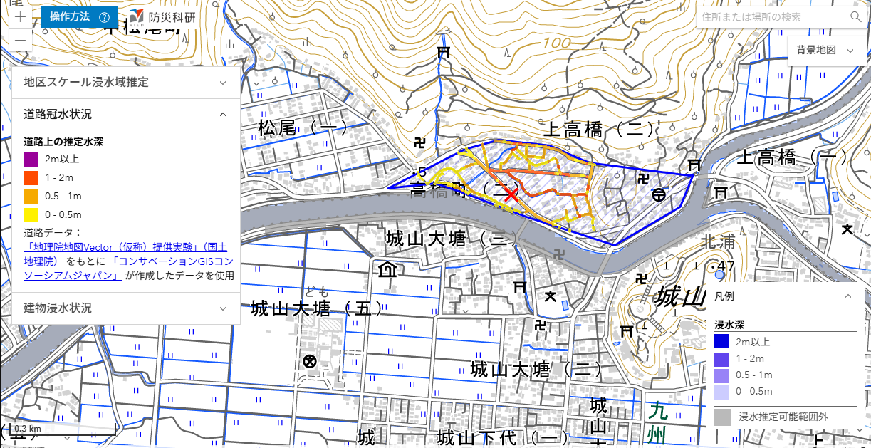 ここでは,推定された浸水深分布を公開しています(速報につき変更されることがあります)。