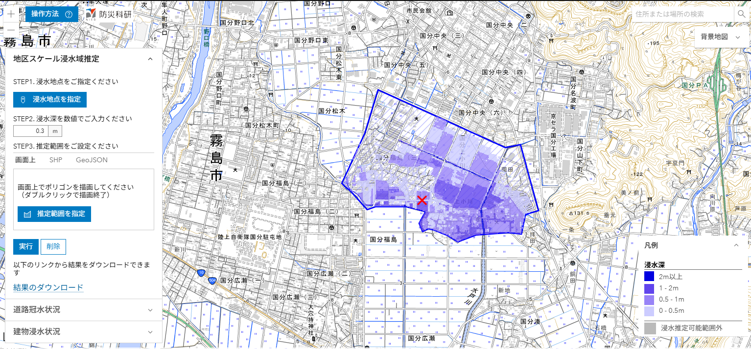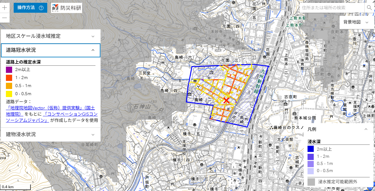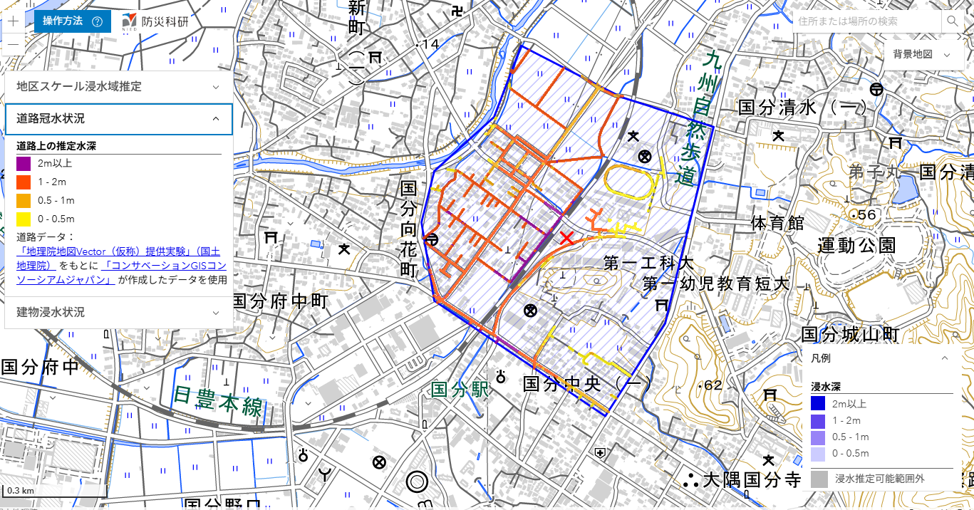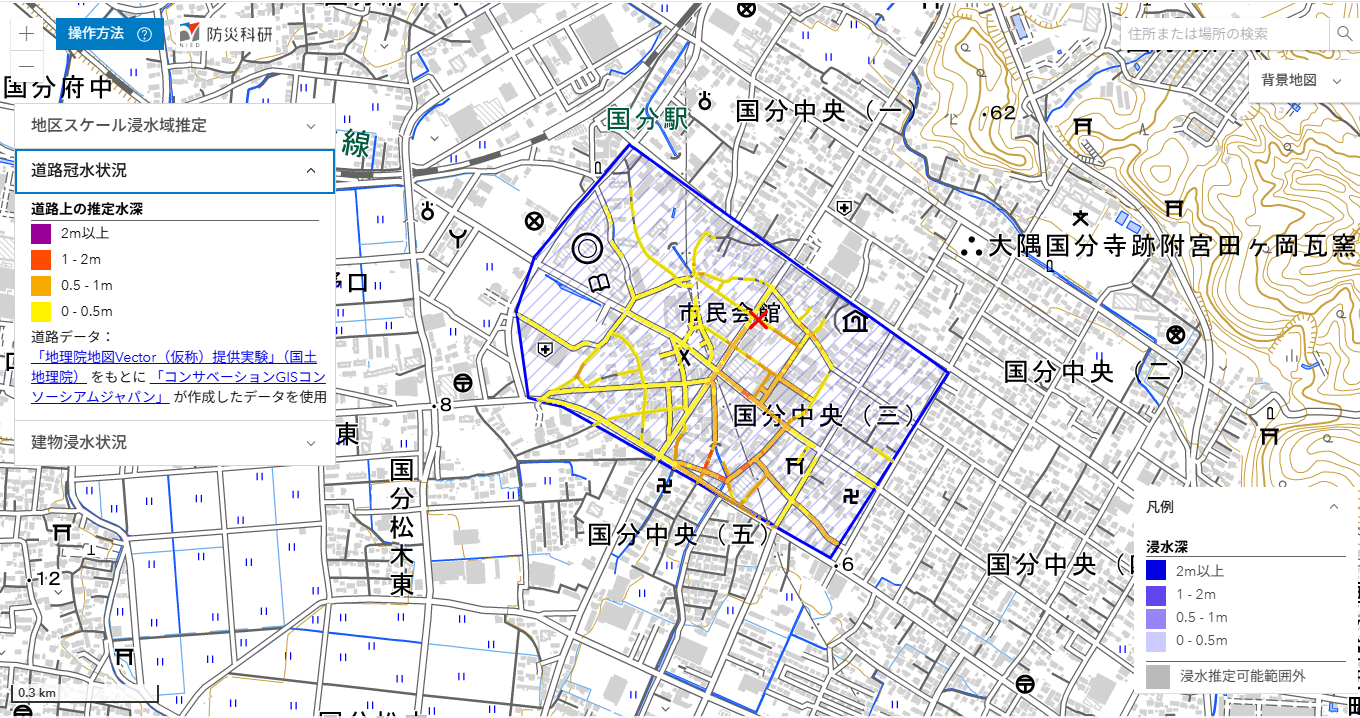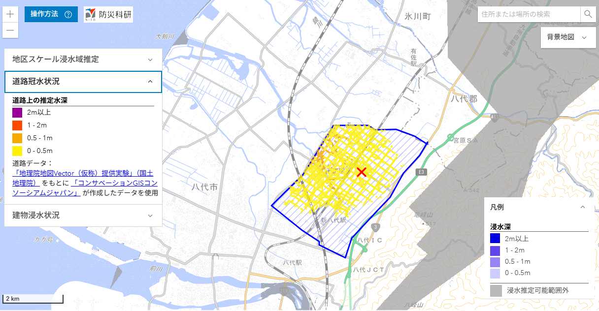 ここでは,推定された浸水深分布を公開しています(速報につき変更されることがあります)。
