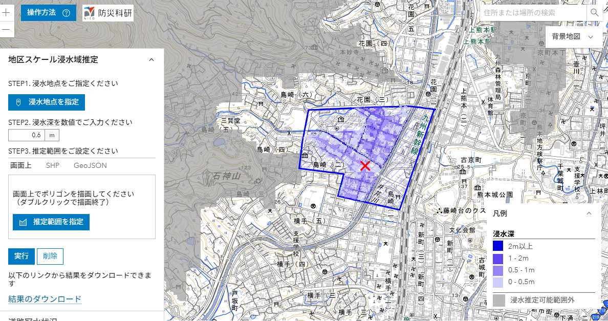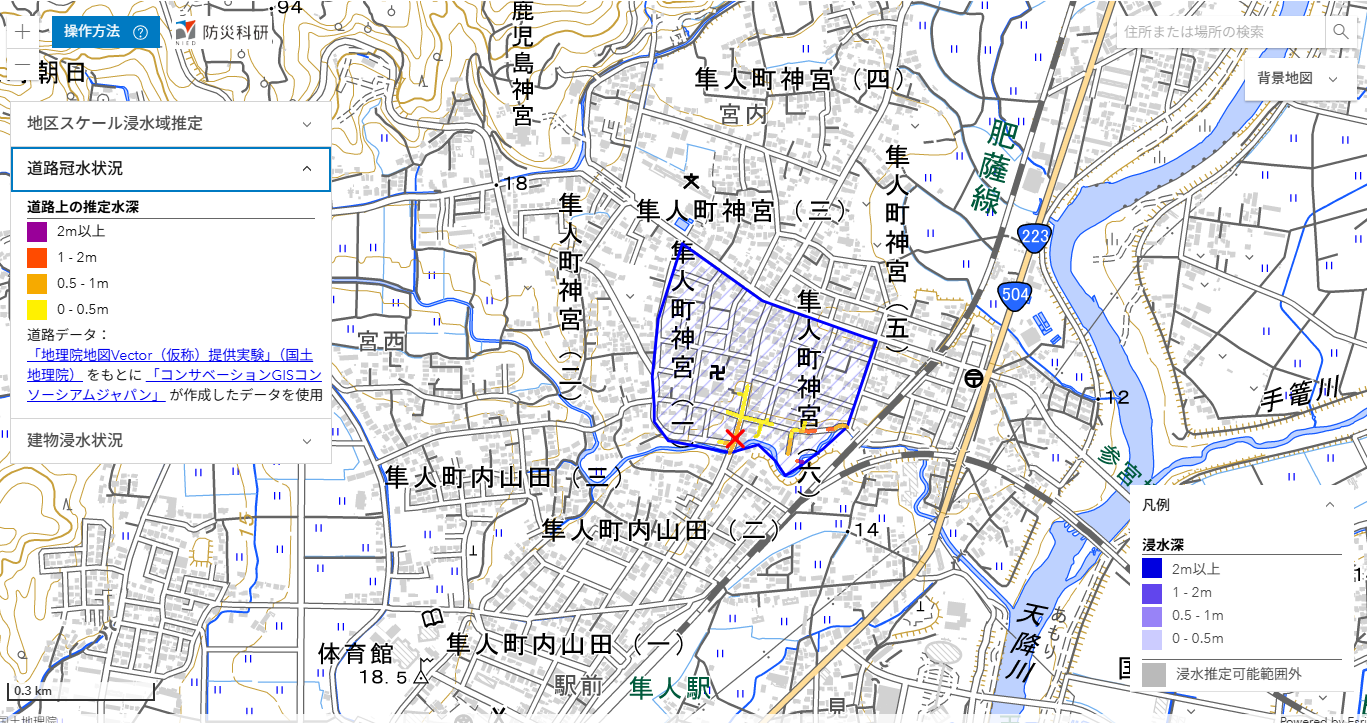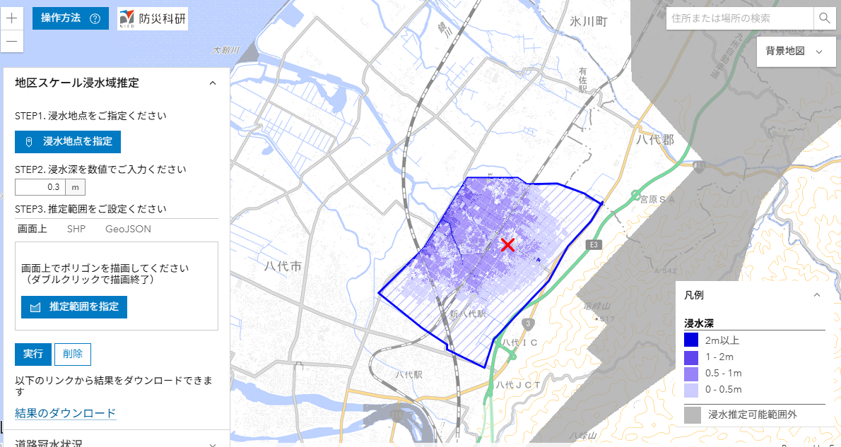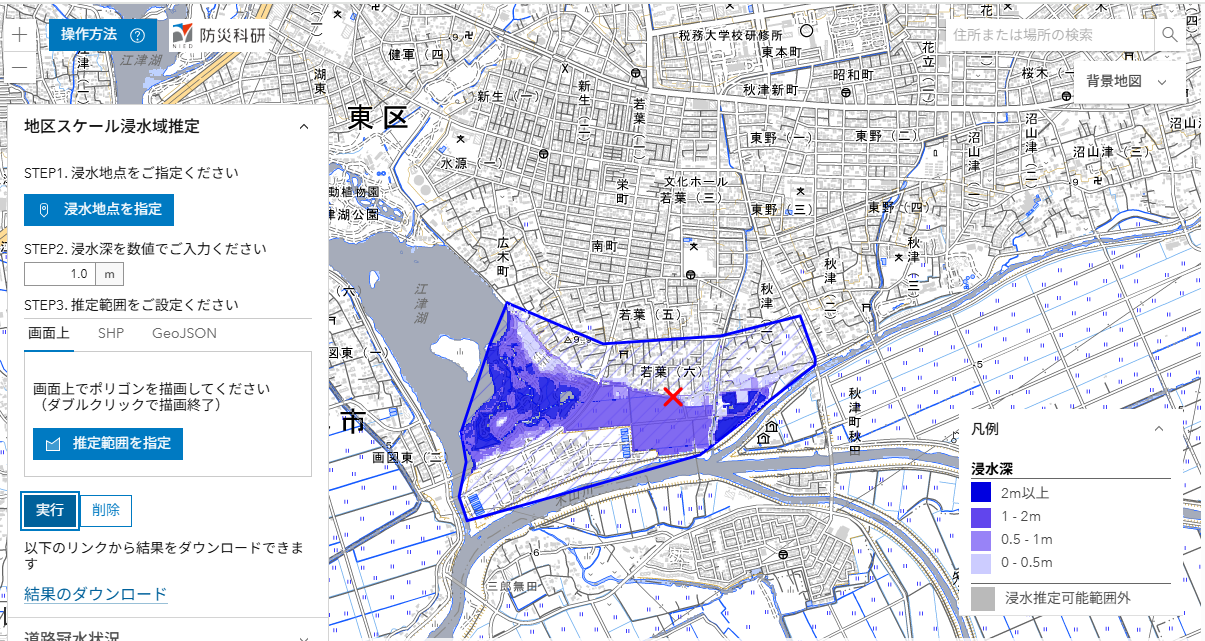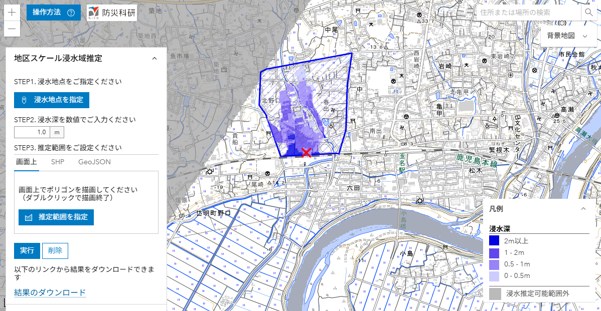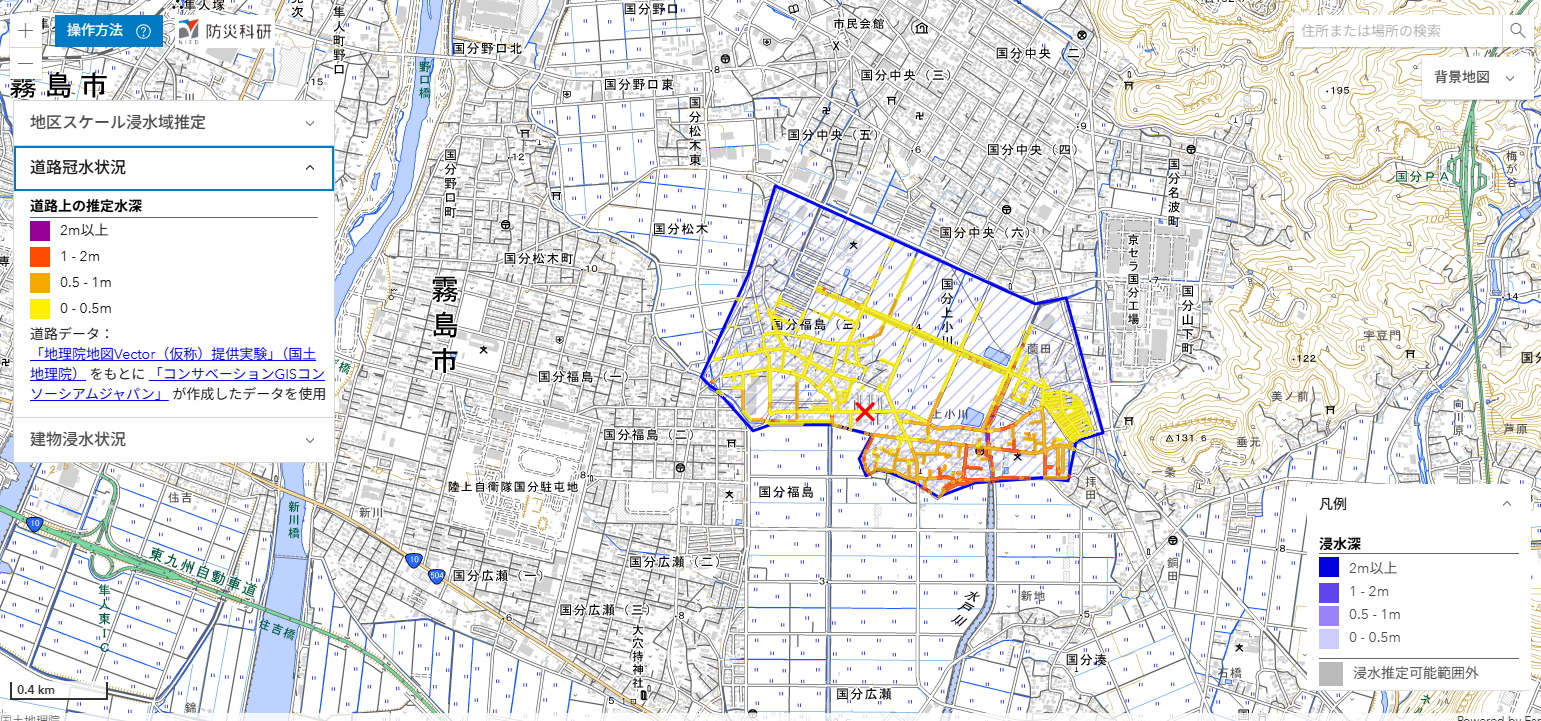 ここでは,推定された浸水深分布を公開しています(速報につき変更されることがあります)。