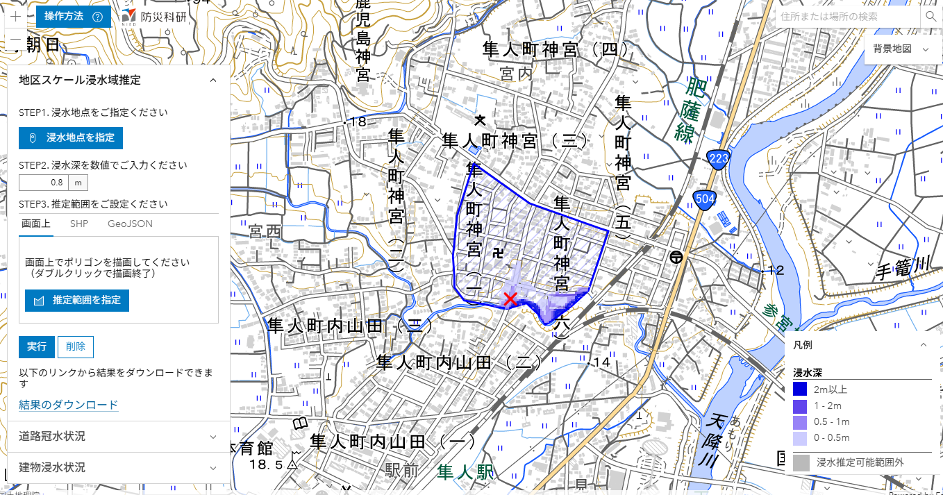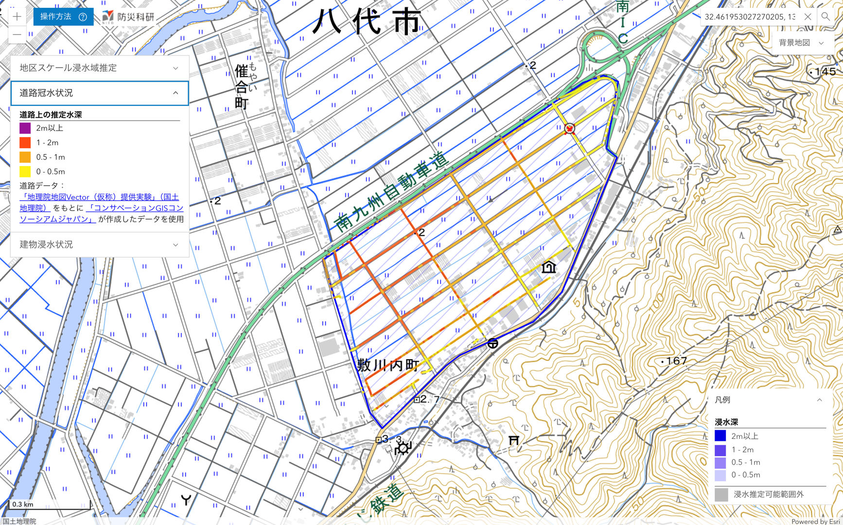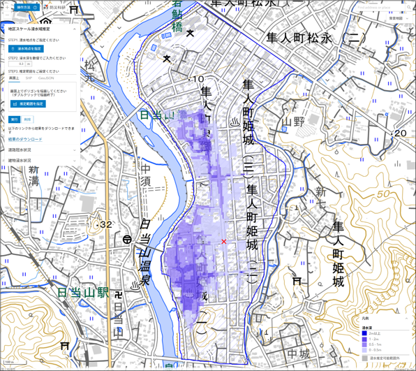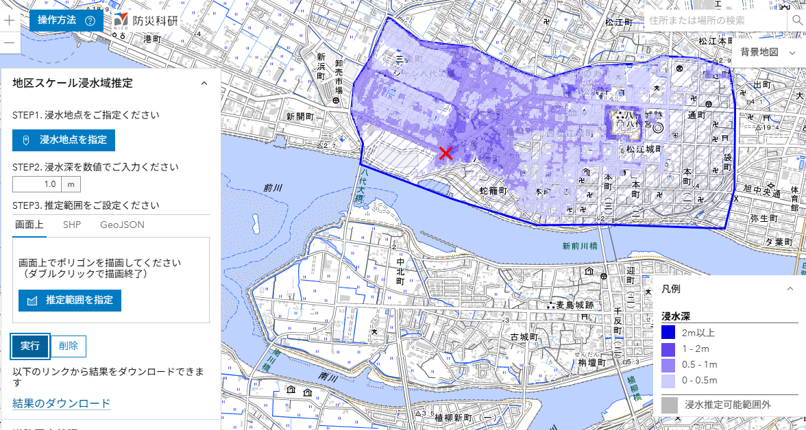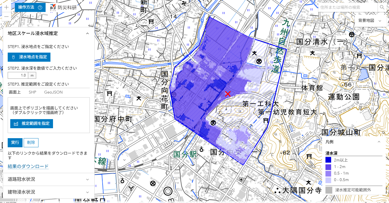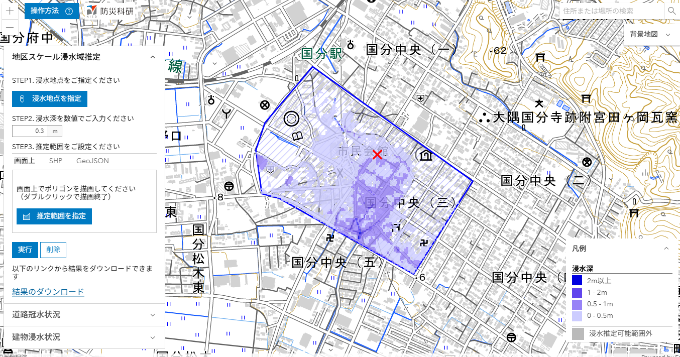 ここでは,推定された浸水深分布を公開しています(速報につき変更されることがあります)。