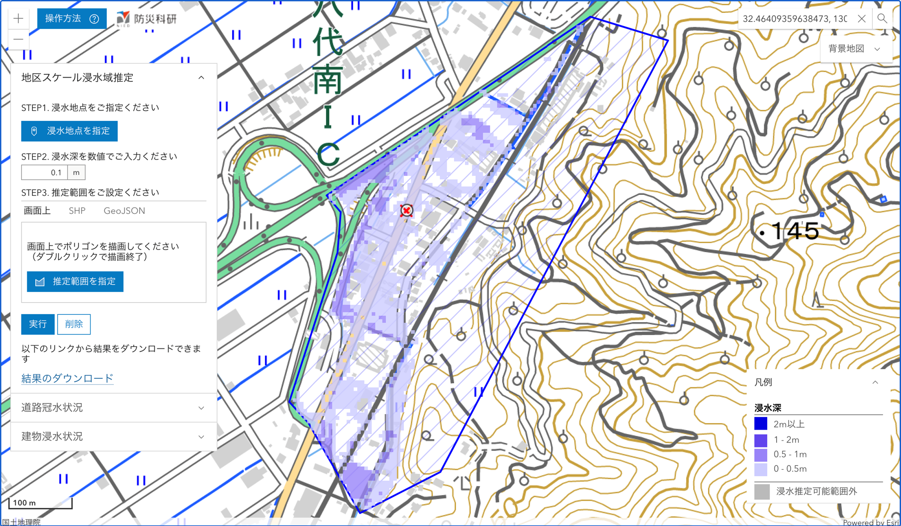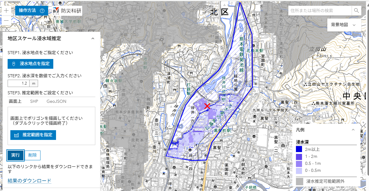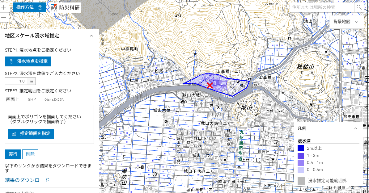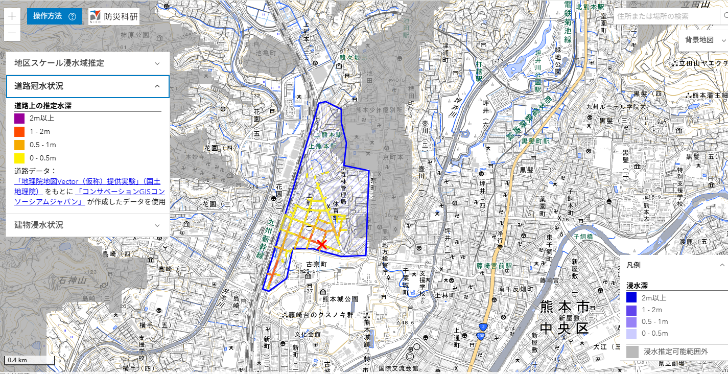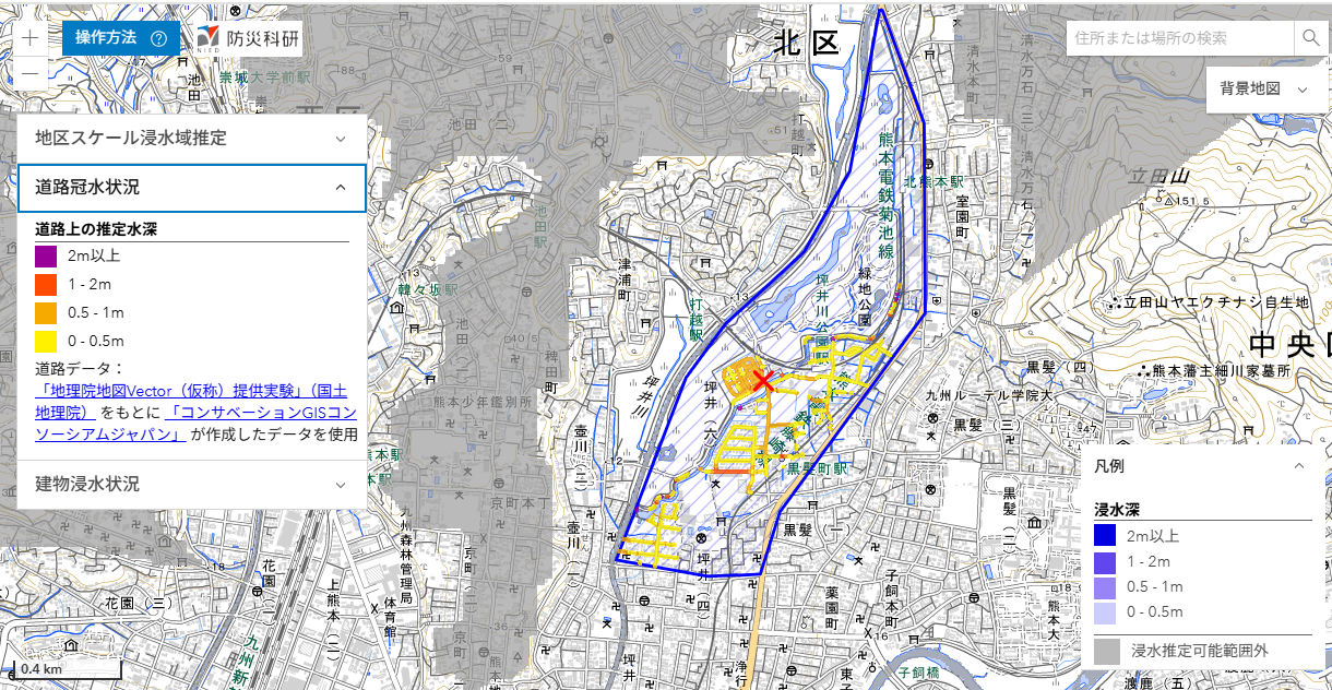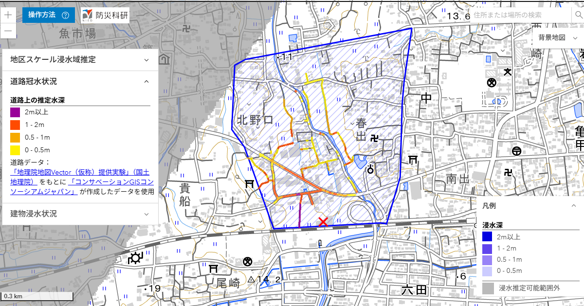 SNSにおける写真から,参考地点における浸水の深さを仮定して,周辺地域内の浸水状況を推定しました.