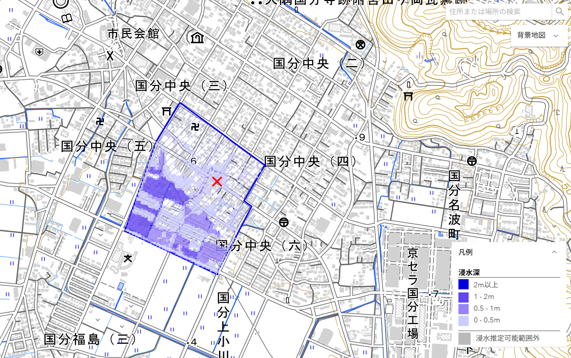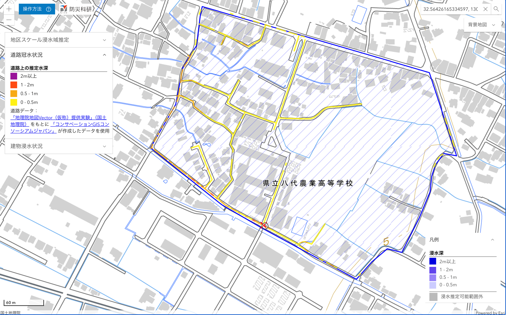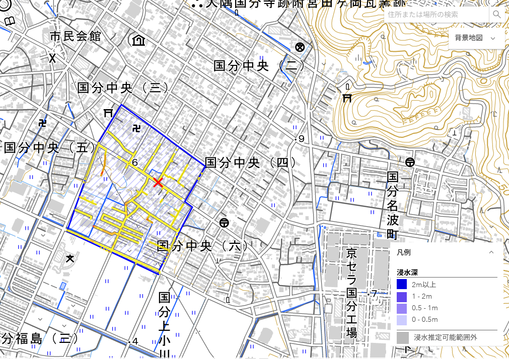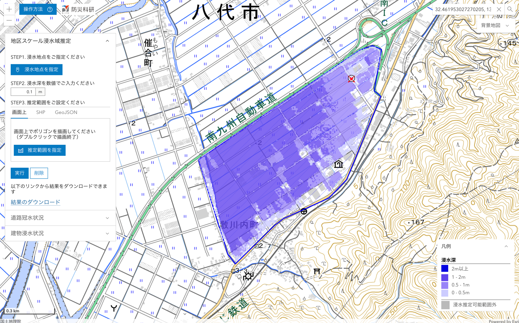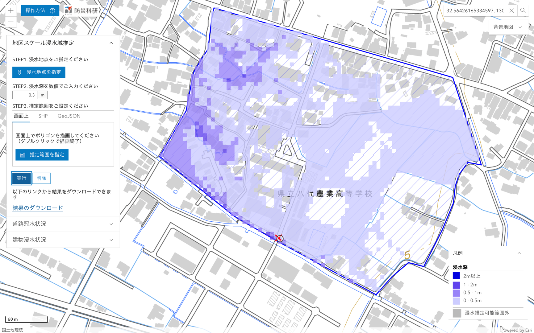 SNSにおける写真から,参考地点における浸水の深さを仮定して,周辺地域内の浸水状況を推定しました.
