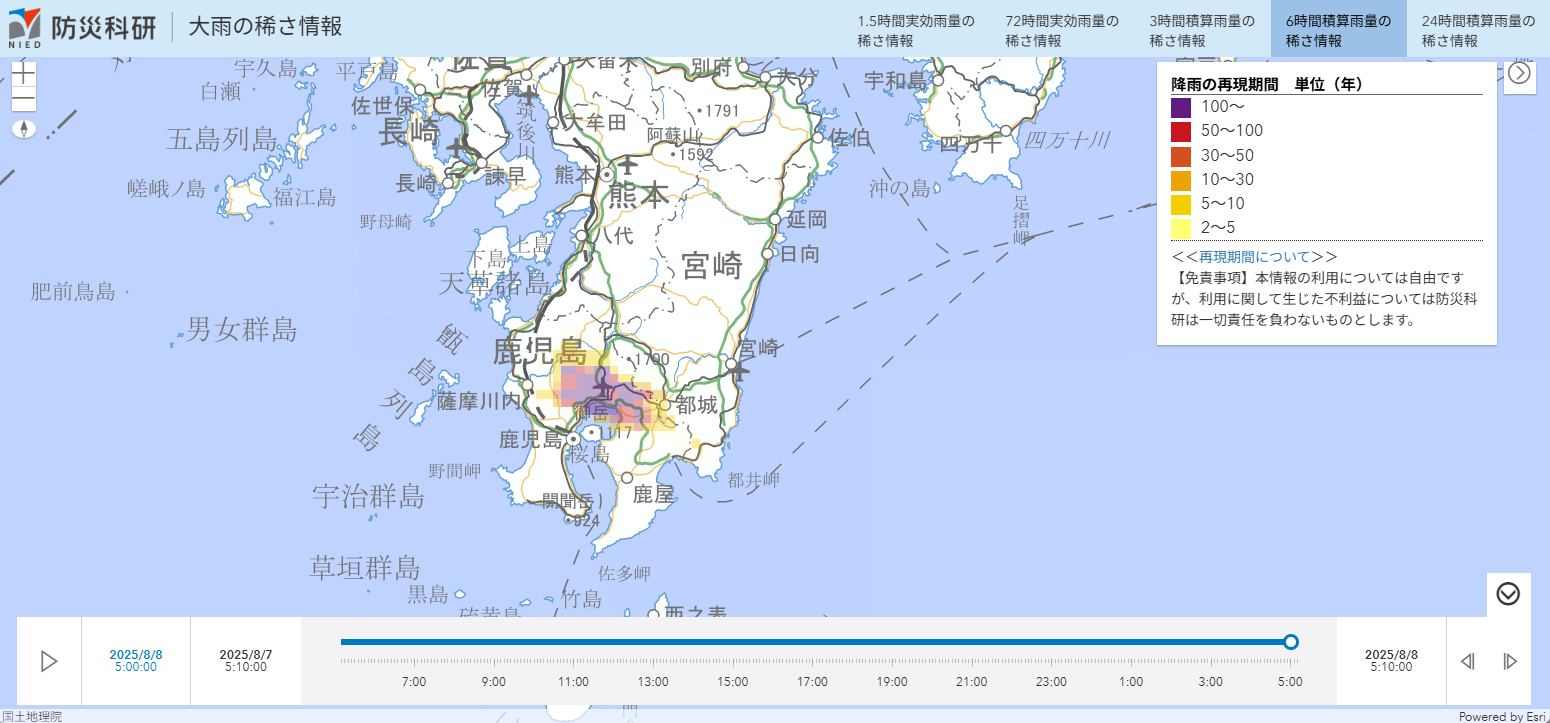 8月8日5時00分までの6時間積算雨量の稀さ(再現期間)