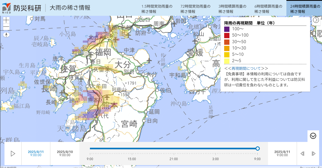 8月11日9時00分までの24時間積算雨量の稀さ(再現期間)